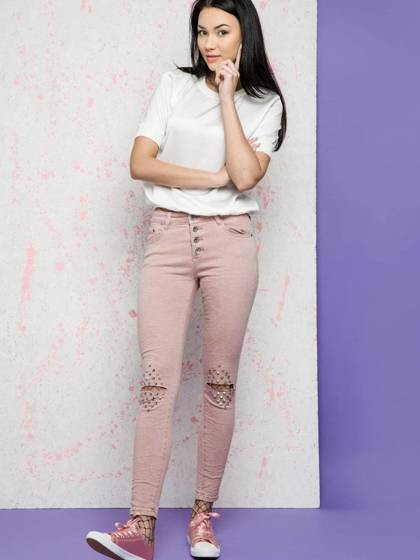 Jeansy Euphory zdobione przecięciami i dżetami na kolanach różowe
