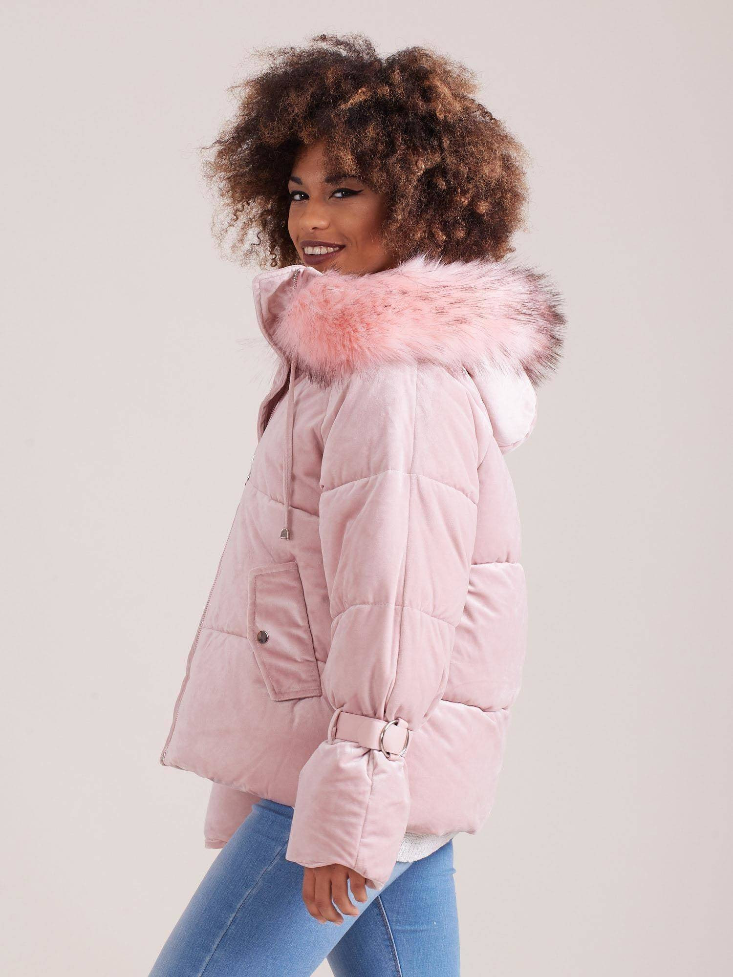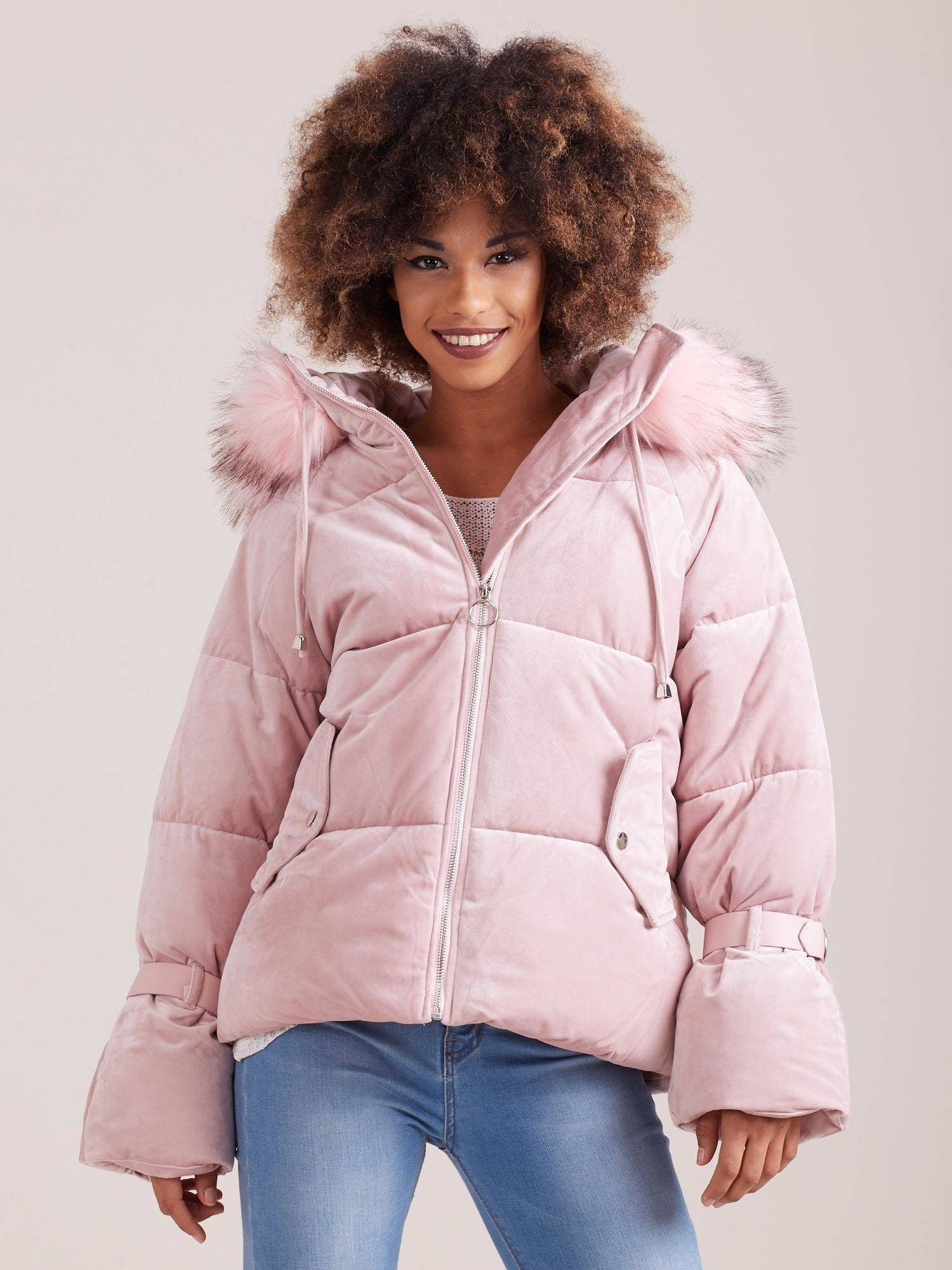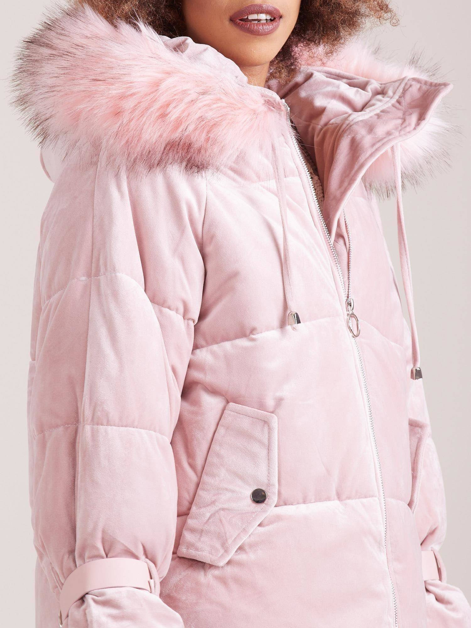 Ciepła kurtka typu puffer z przyjemnego w dotyku weluru z ozdobnym paskiem na rękawach. Model posiada szeroką formę oraz kaptur z futerkiem. Posiada klasyczne zapięcie na zamek.