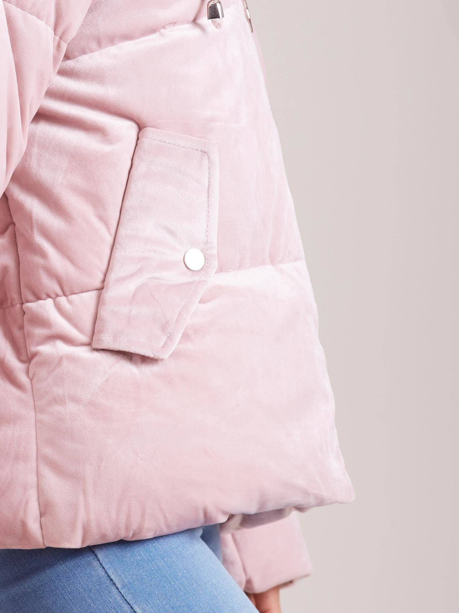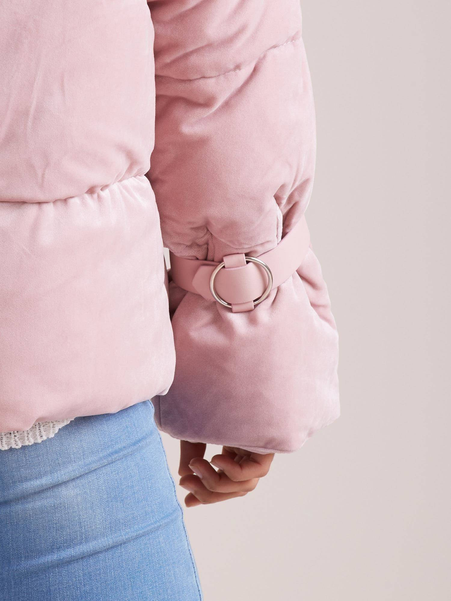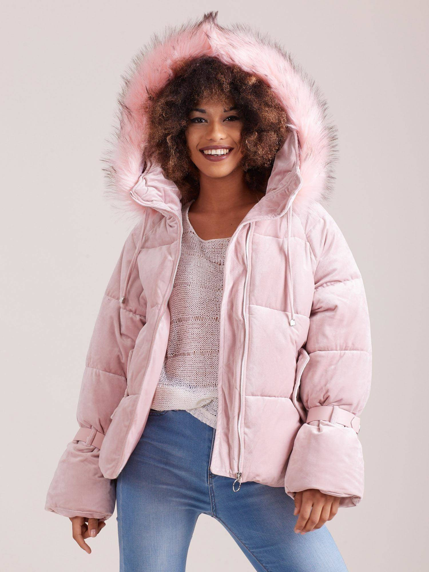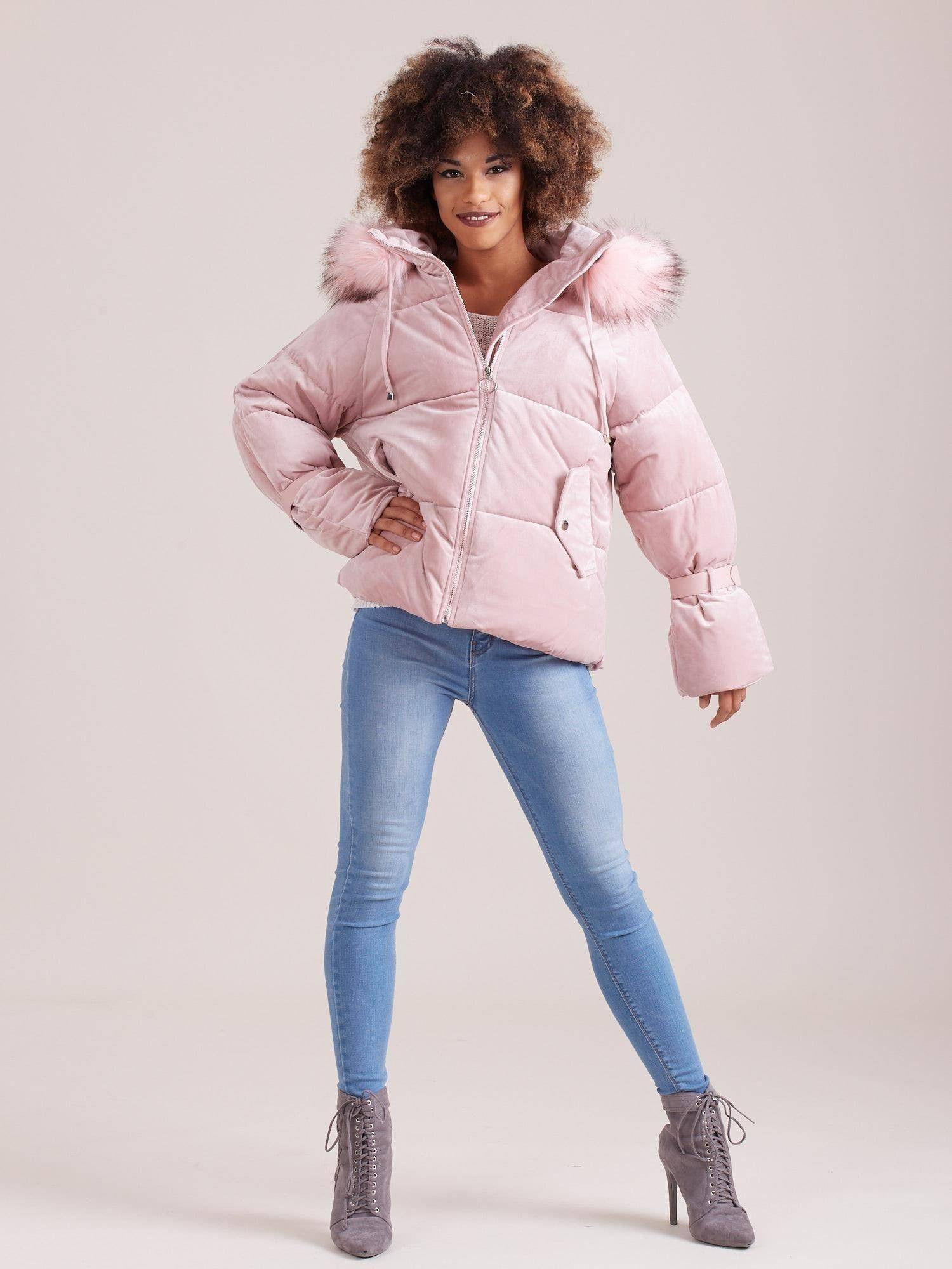 Ciepła kurtka typu puffer z przyjemnego w dotyku weluru z ozdobnym paskiem na rękawach. Model posiada szeroką formę oraz kaptur z futerkiem. Posiada klasyczne zapięcie na zamek.
