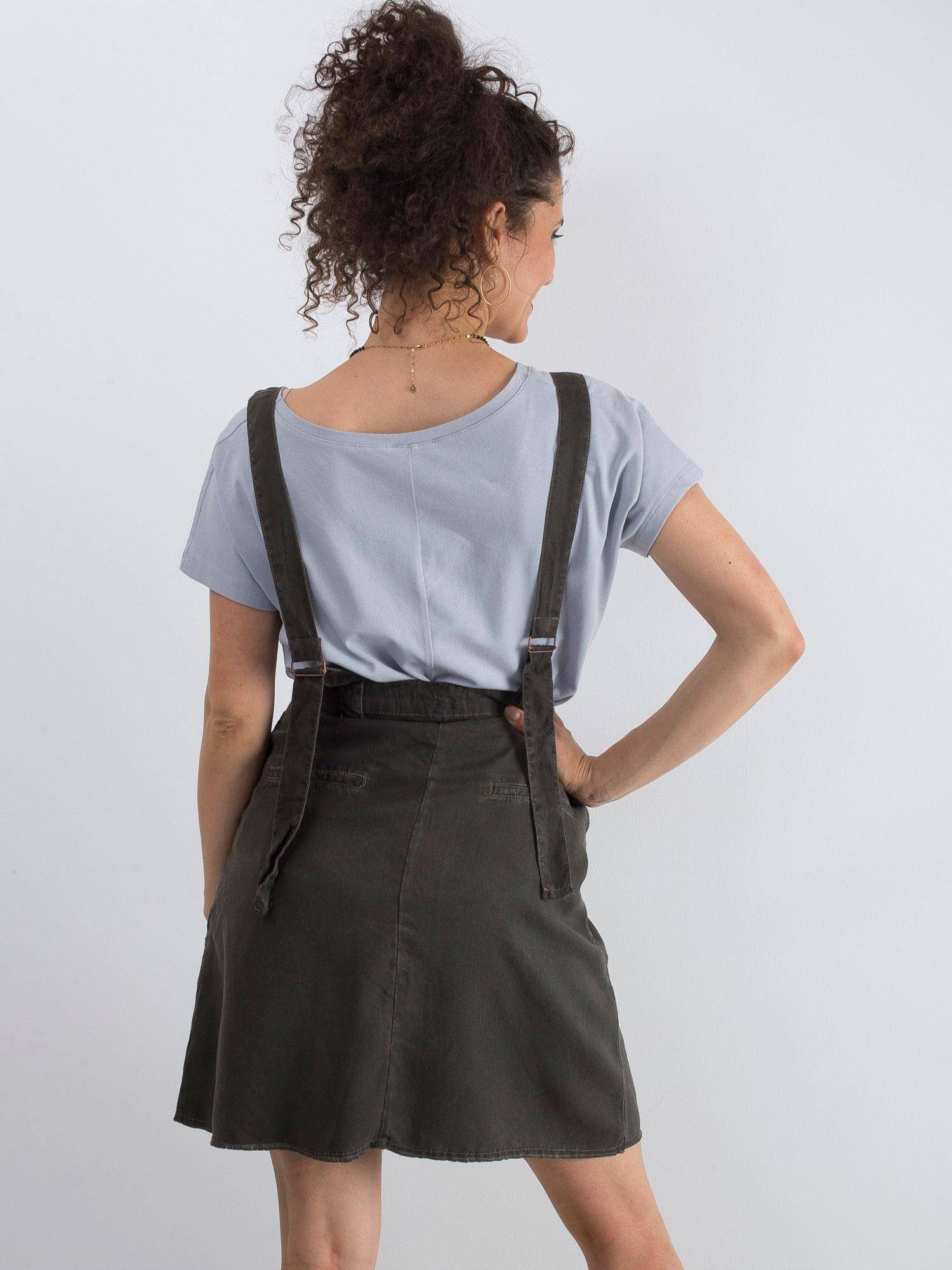 Oryginalna spódnica na szelkach zdobiona dużymi kieszeniami. Model z klasycznym zapięciem na zamek i guzik.