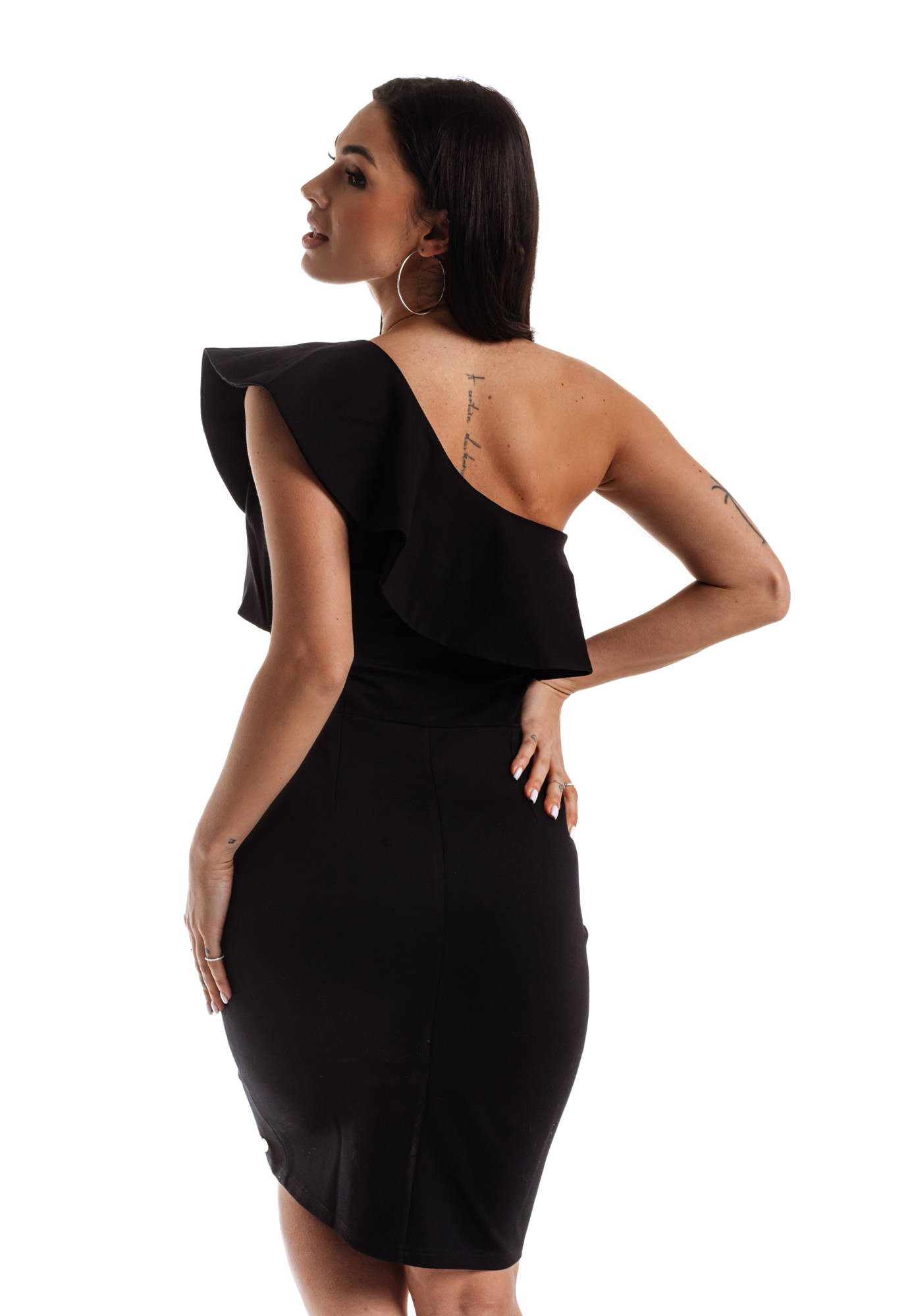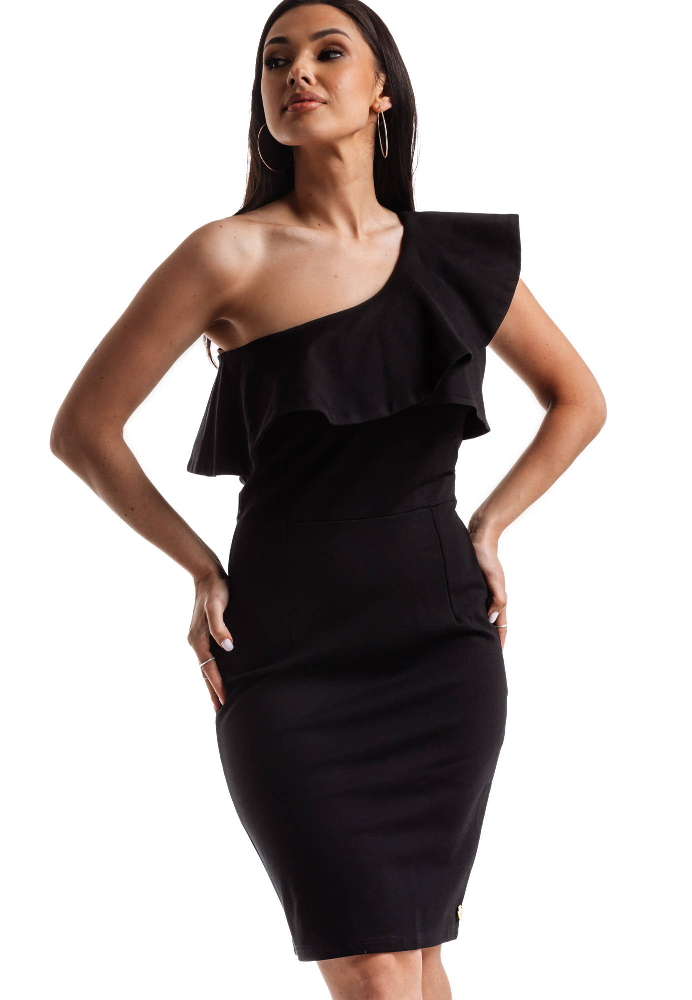 Sukienka polskiej kolekcji La Diva wykonana z szykownego i eleganckiego materiału, a jednocześnie lekko elastycznego. Model posiada dopasowaną formę z efektownym dekoltem odsłaniającym jedno ramię. Dekolt zdobiony dekoracyjną falbanką. Sukienka zapinana z boku na zameczek.