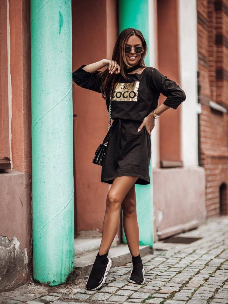 Wykonana z miękkiej, przyjemnej w noszeniu dzianiny sukienka polskiej kolekcji Cocomore. Model zdobiony na przodzie złotym printem oraz rozcięciem na ramieniu.