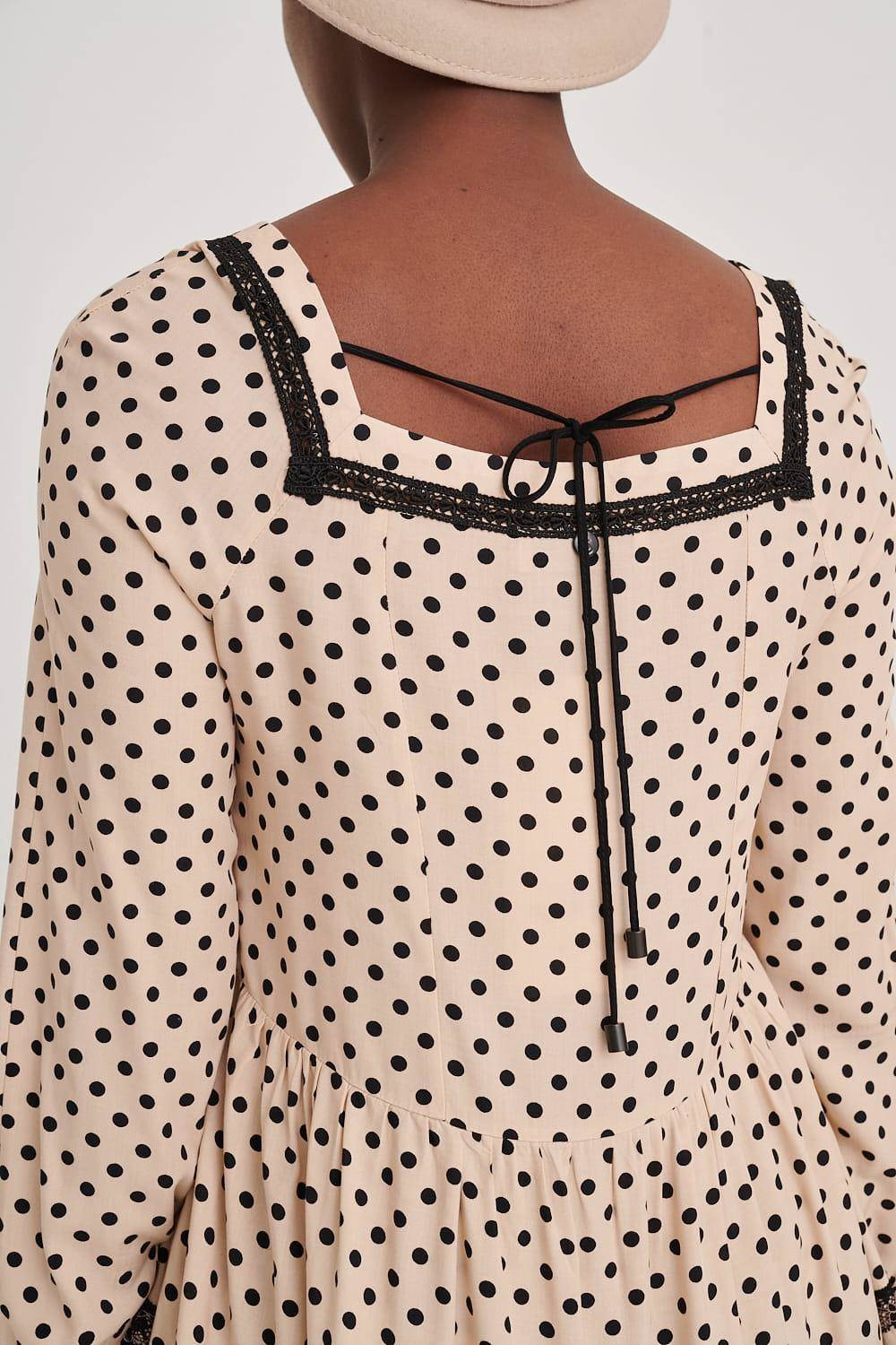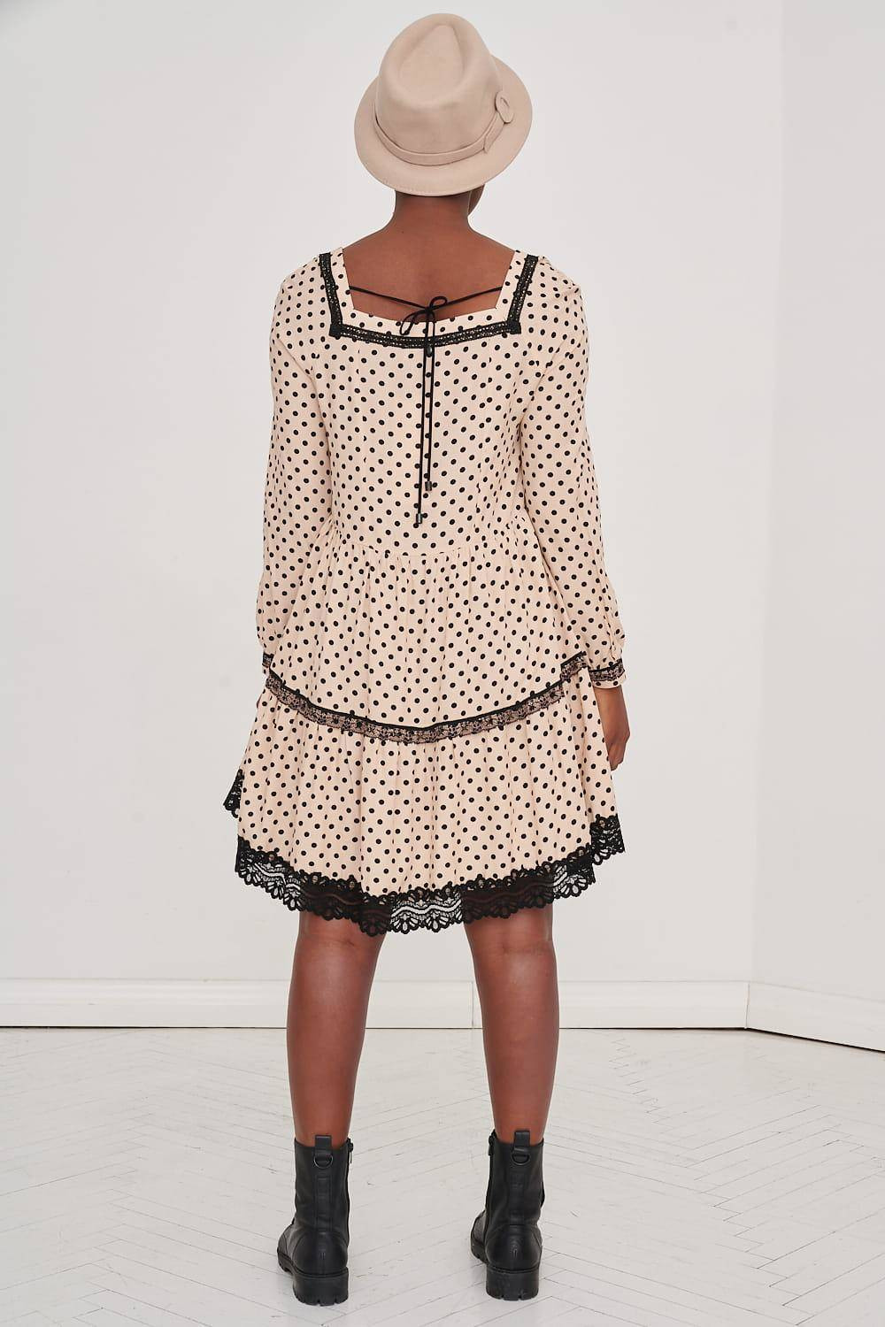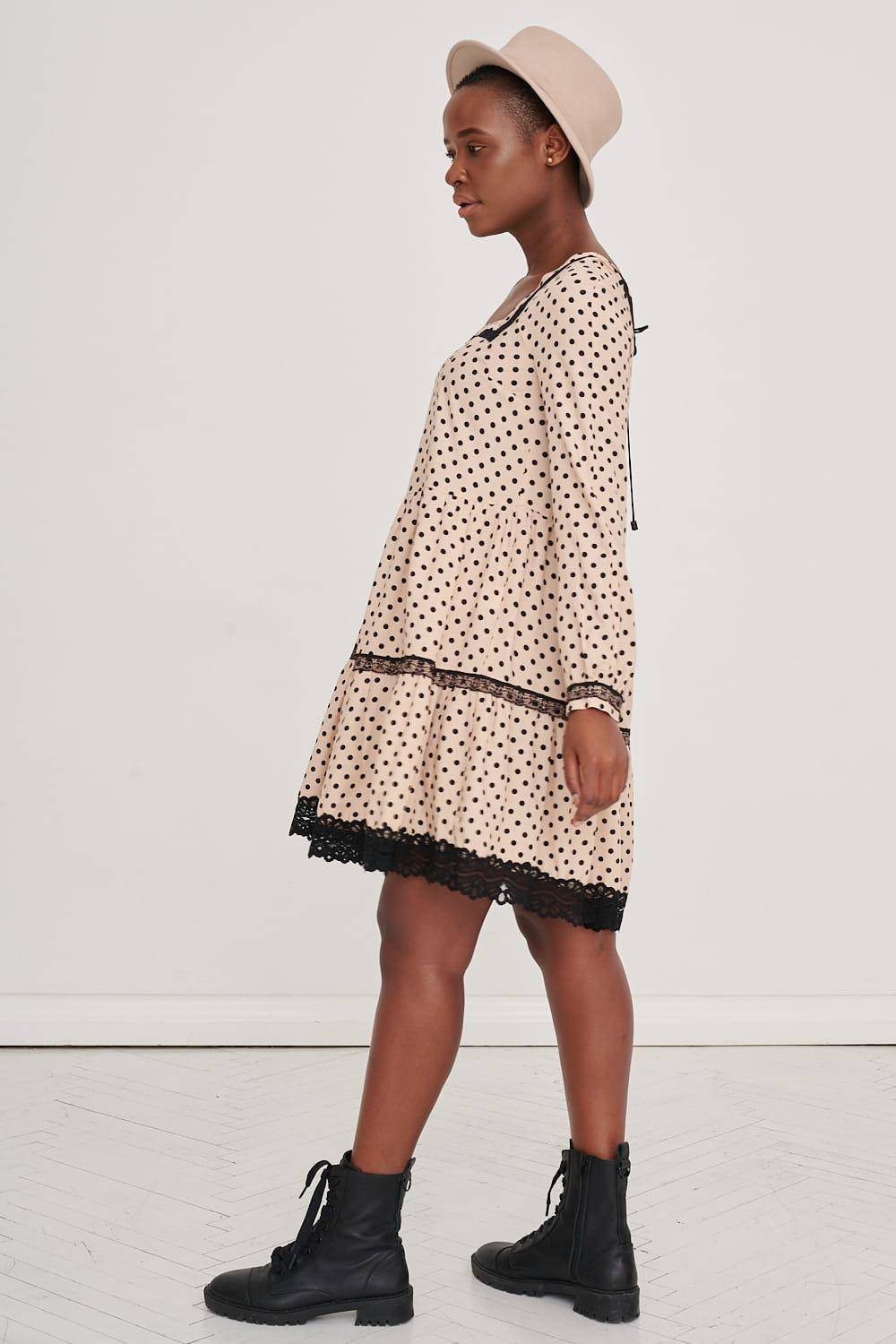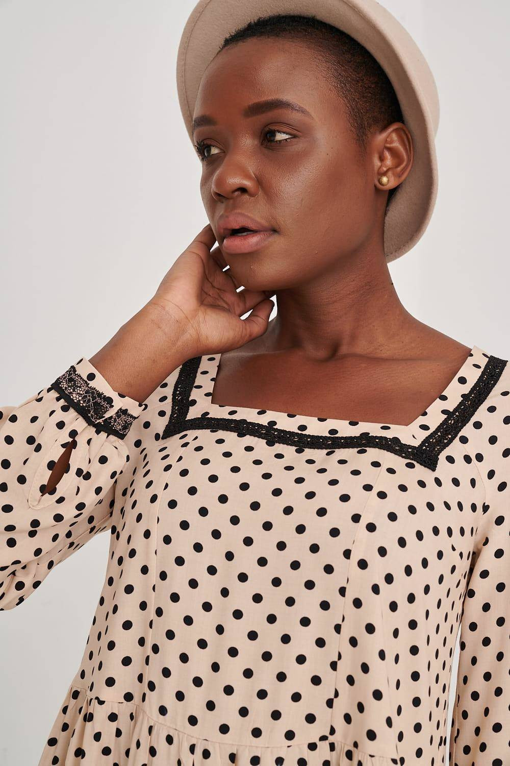 Beżowa sukienka w groszki z dekoltem caro Blue Shadow