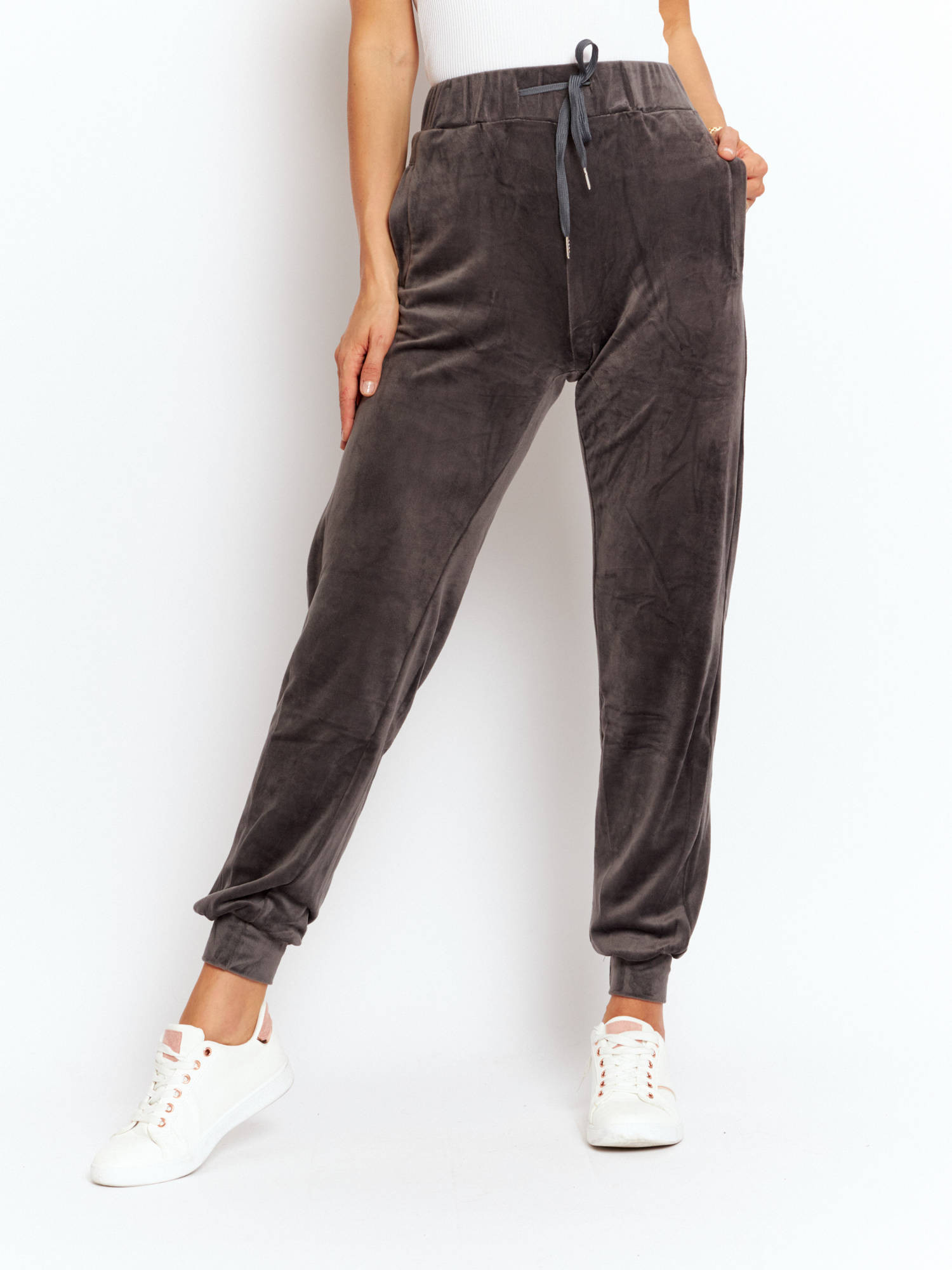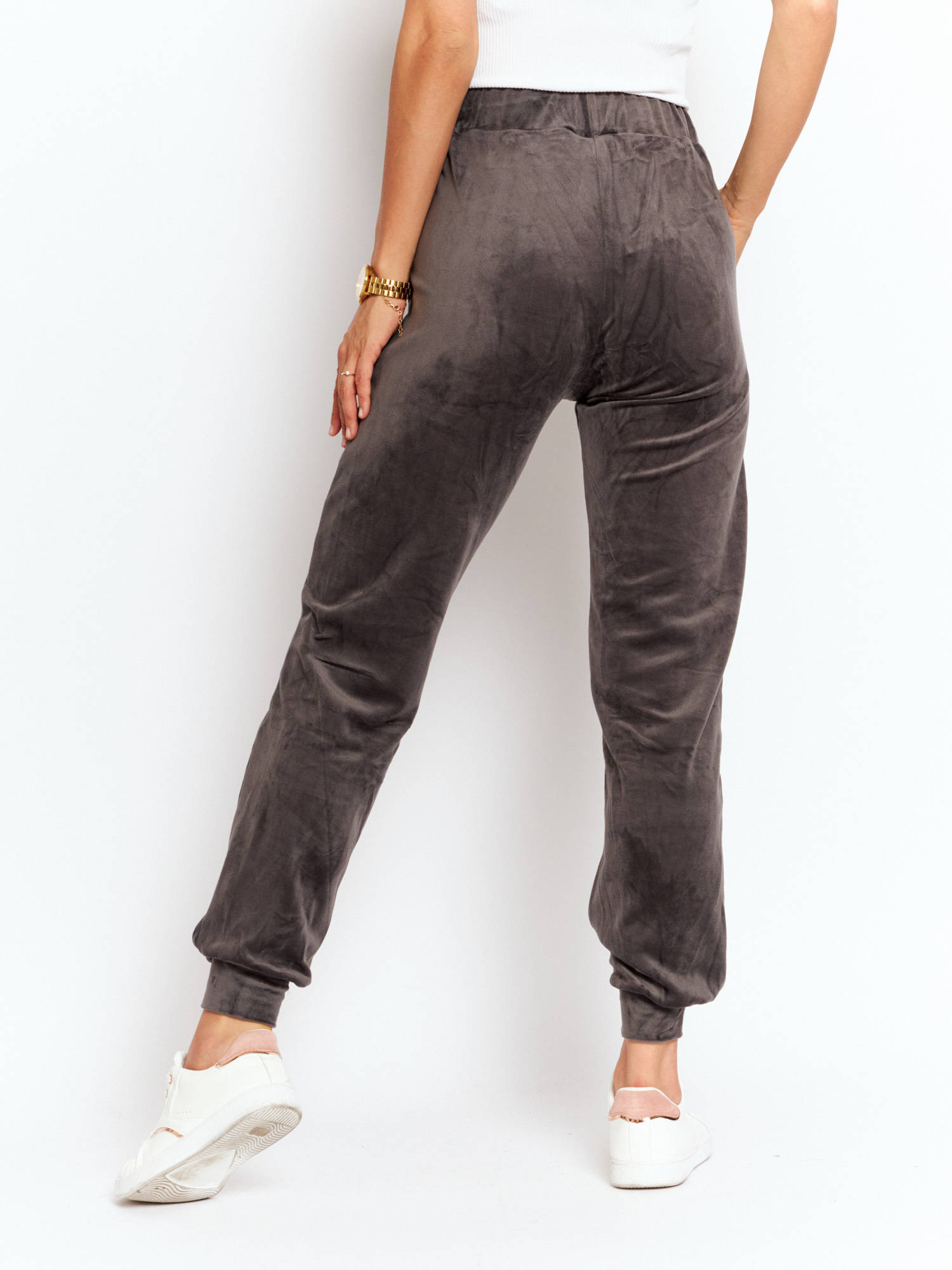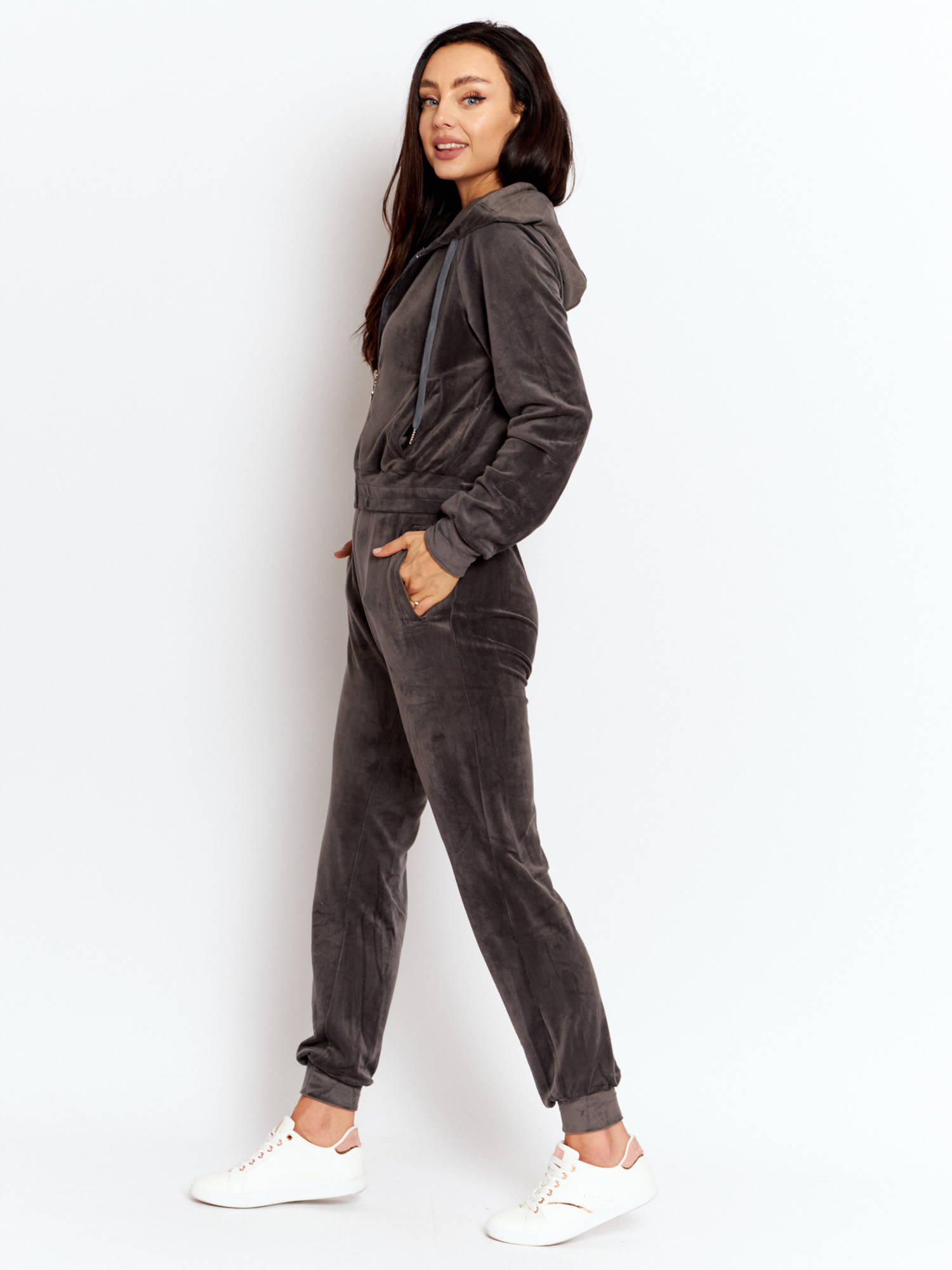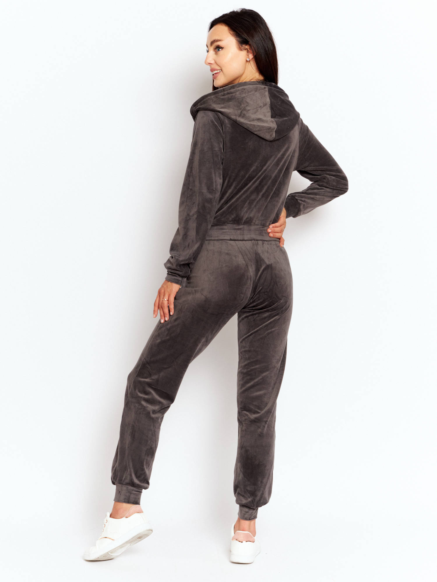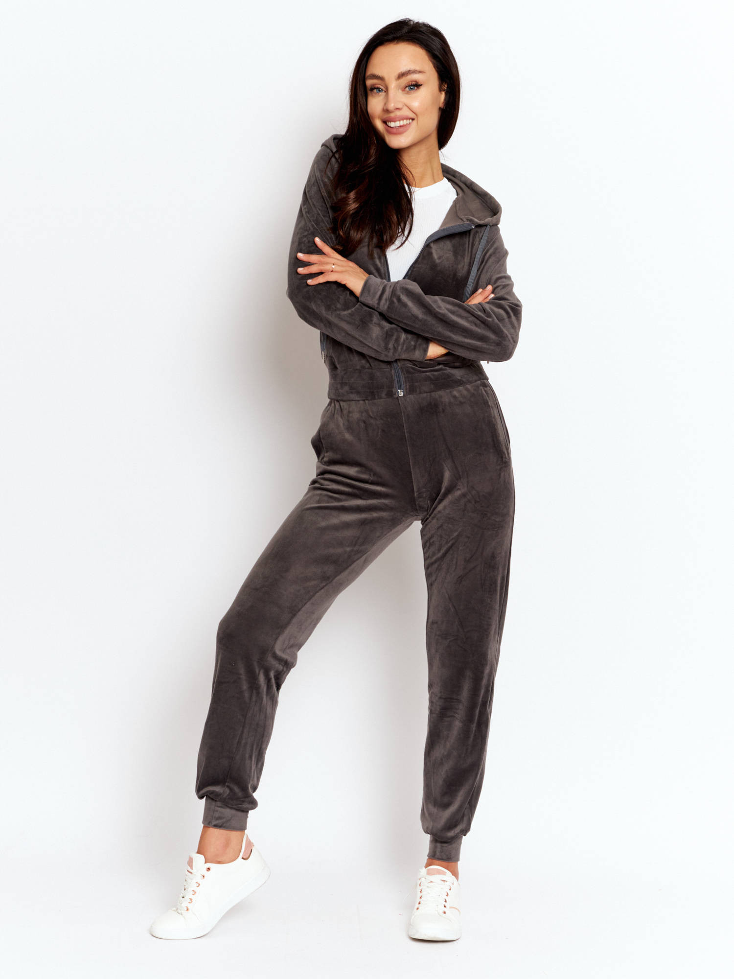 Genianlny komplet dresowy z mięciutkiego weluru z kolekcji Yups. Komplet składa się z krótkiej bluzy z kapturem oraz klasycznych spodni sportowych. Bluza zapinana na zamek. Posiada wpuszczane kieszenie oraz reglanowe rękawy. Bluza posiada nieco luźniejszy fason świetnie komponuje się ze spodniami z lekko podwyższonym stanem, dzięki czemu doskonale zachowuje proporcje sylwetki. Klasyczne spodnie z komfortową gumką w talii. Nogawki zakończone tzw. 'mankietem'. Wygodny a zarazem elegancki komplet welurowy doskonale wpisuje się w panujące trendy!