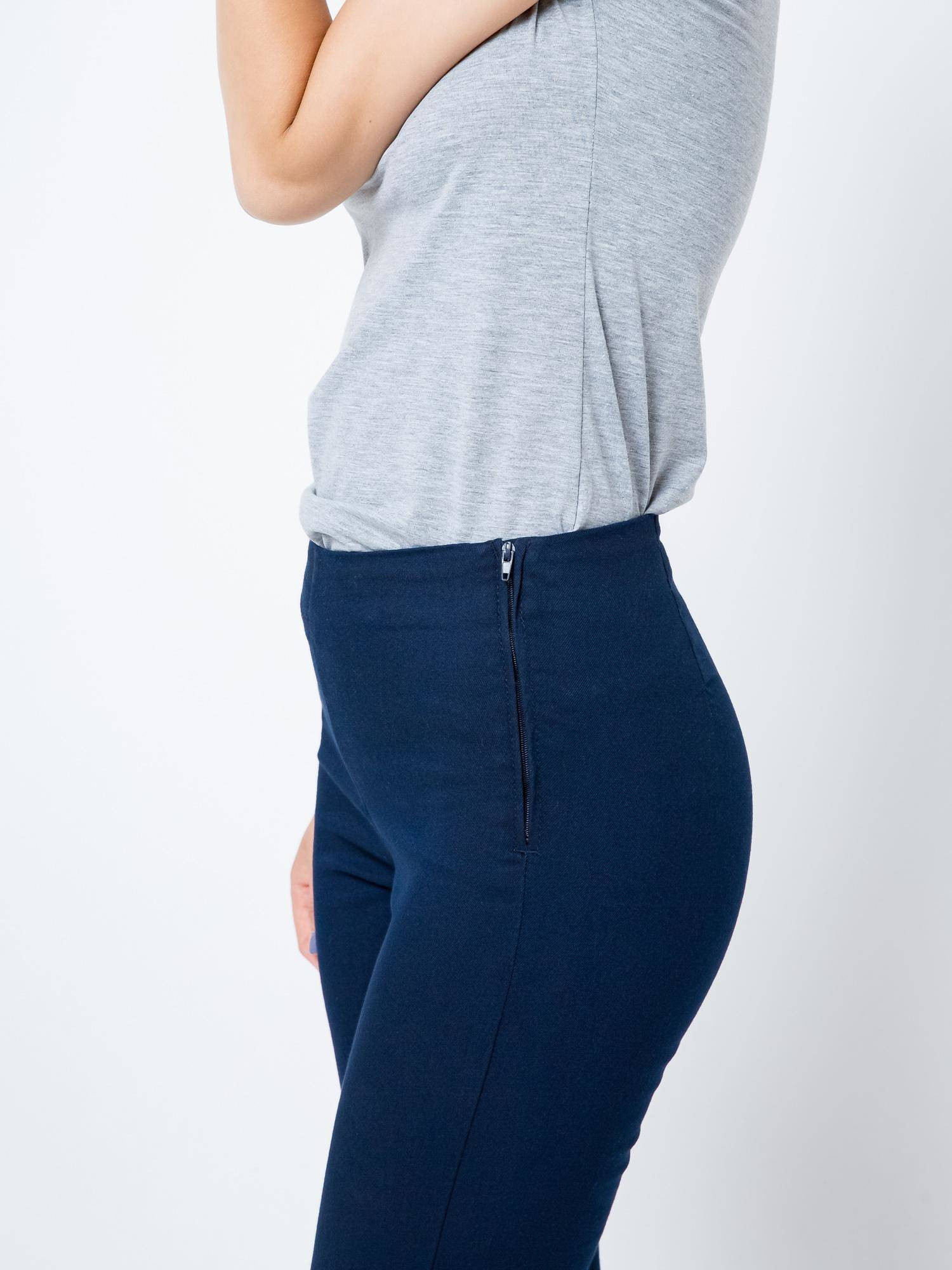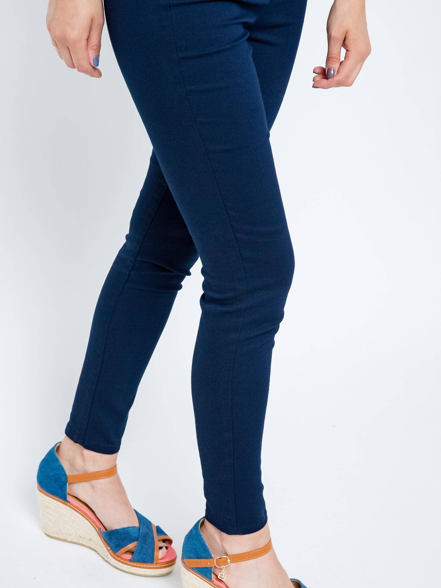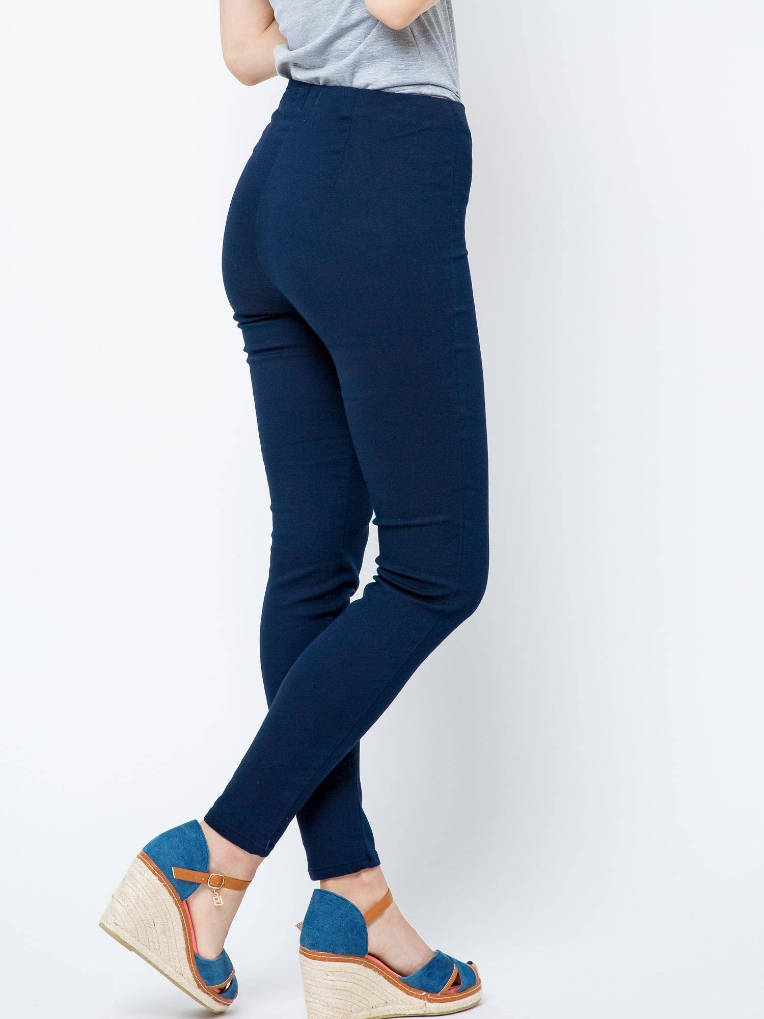 Komfortowe jegginsy w kolorze granatowym. Wykonane z lekko elastycznego materiału ładnie dopasowują się do sylwetki. Model z wysokim stanem, z boku zapinane na zameczek. Bardzo wygodne.