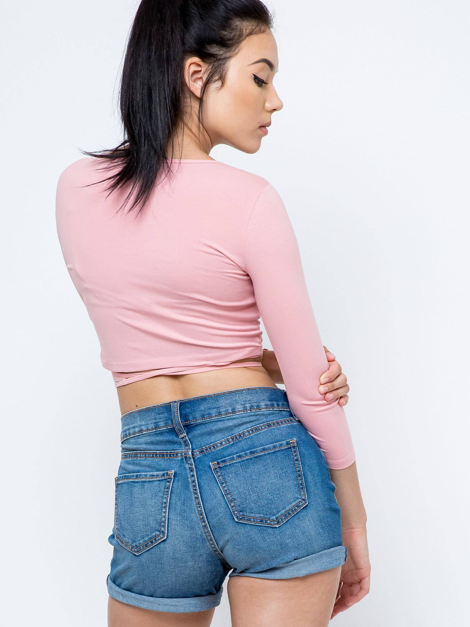 Bardzo oryginalna, krótka bluzka wykonana z lekko elastycznej bawełny. Model z długim rękawem i dekoltem w szpic. Posiada zakładany, kopertowy przód i sznureczki do zawiązania. Można ją nosić także jako bolerko.