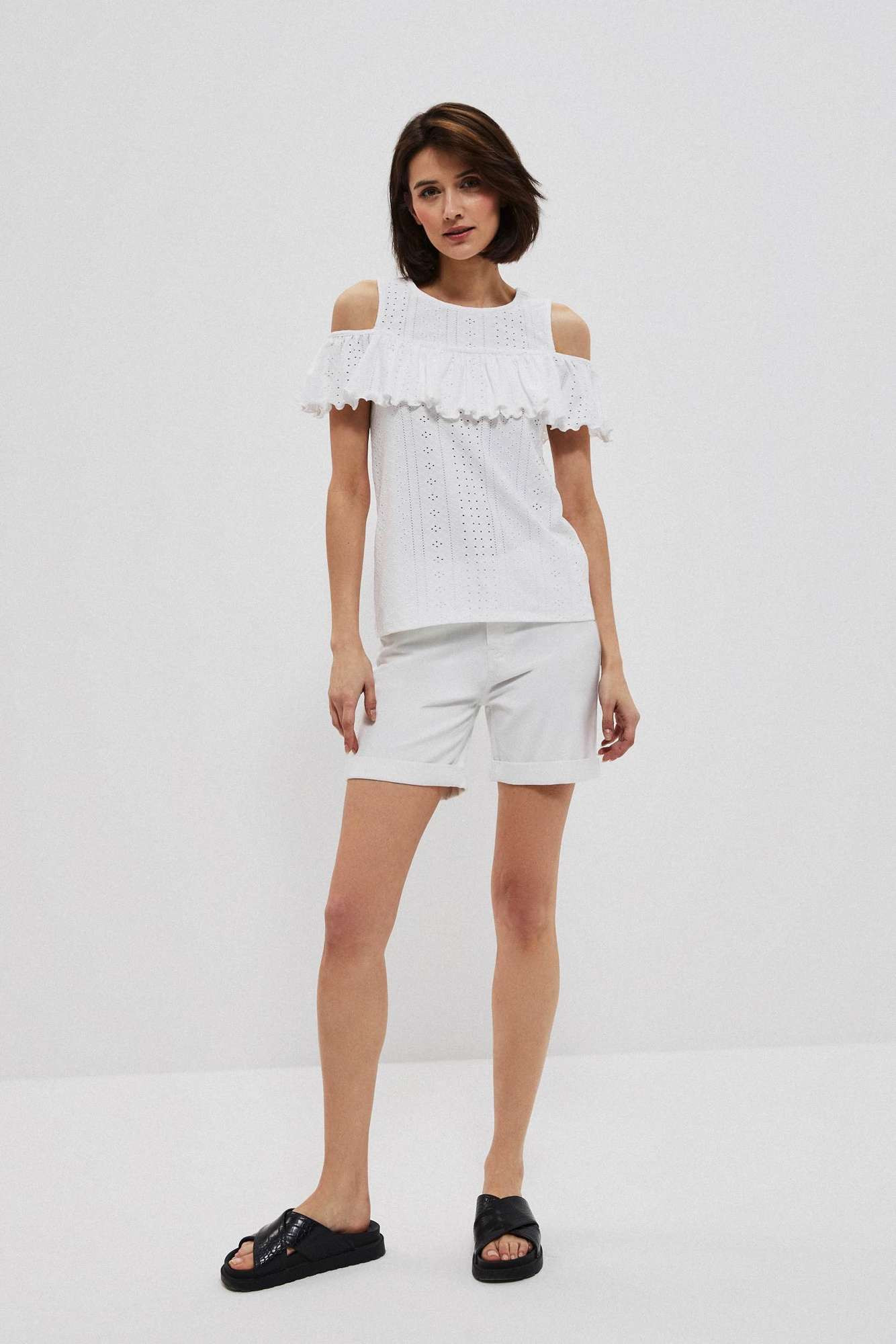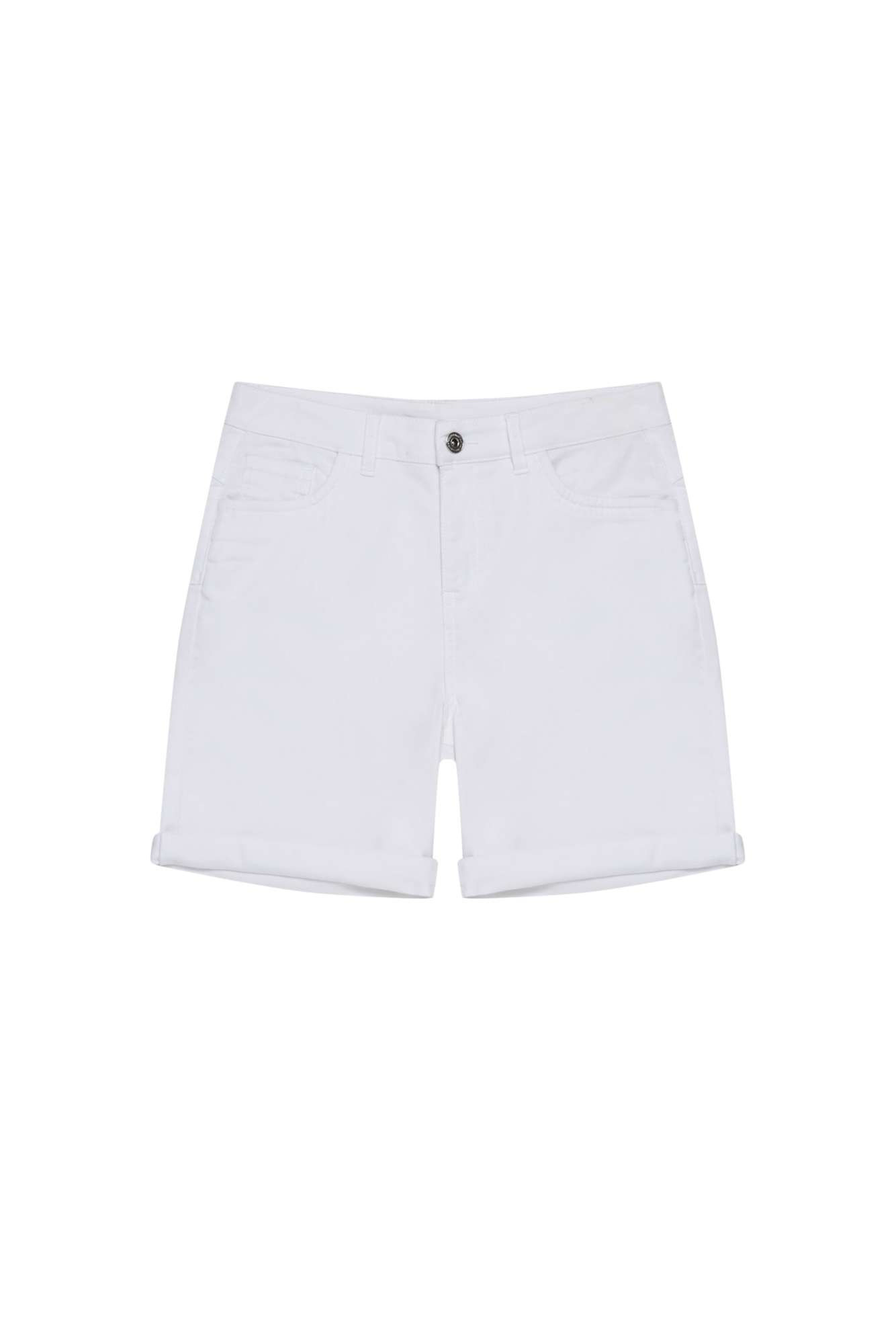 Wykonane z gładkiego, elastycznego materiału spodenki z kolekcji Moodo. Model ze średnim stanem i wywijanymi nogawkami. Posiadają klasyczne zapięcie na zamek i guzik. Po bokach i z tyłu wpuszczane kieszenie. Długość do połowy uda.