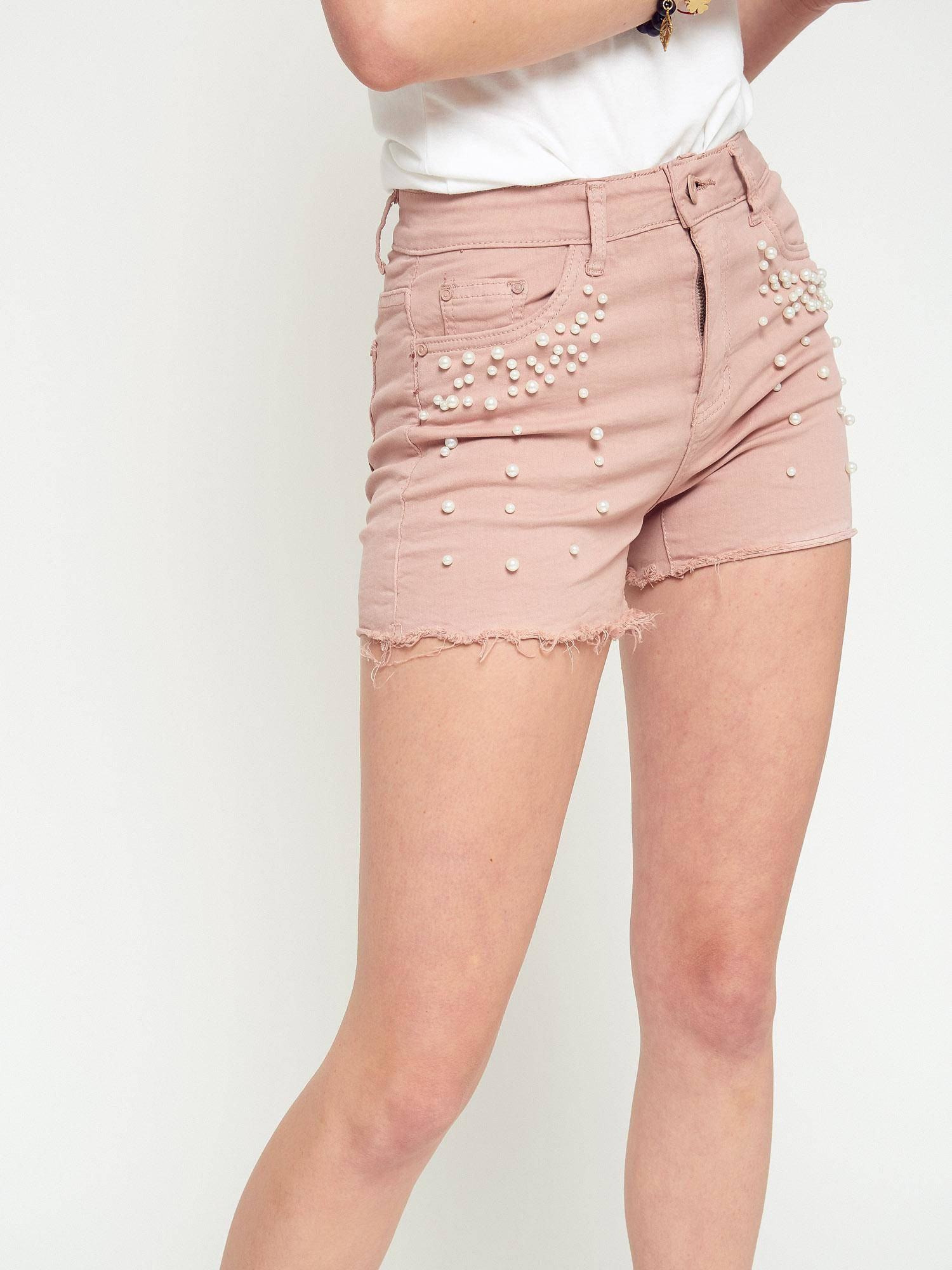 Klasyczne, krótkie szorty ze standardowym rozmieszczeniem kieszeni. Model zdobiony perełkami. Posiada wystrzępione nogawki.