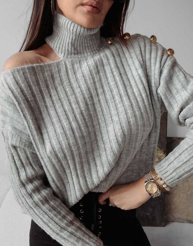 Wyjątkowy sweter o luźnym fasonie i charakterystycznym wycięciem wokół linii szyi wykonany z miękkiej dzianiny w pionowy prążek. Na ramieniu zdobiony złotymi guzikami.