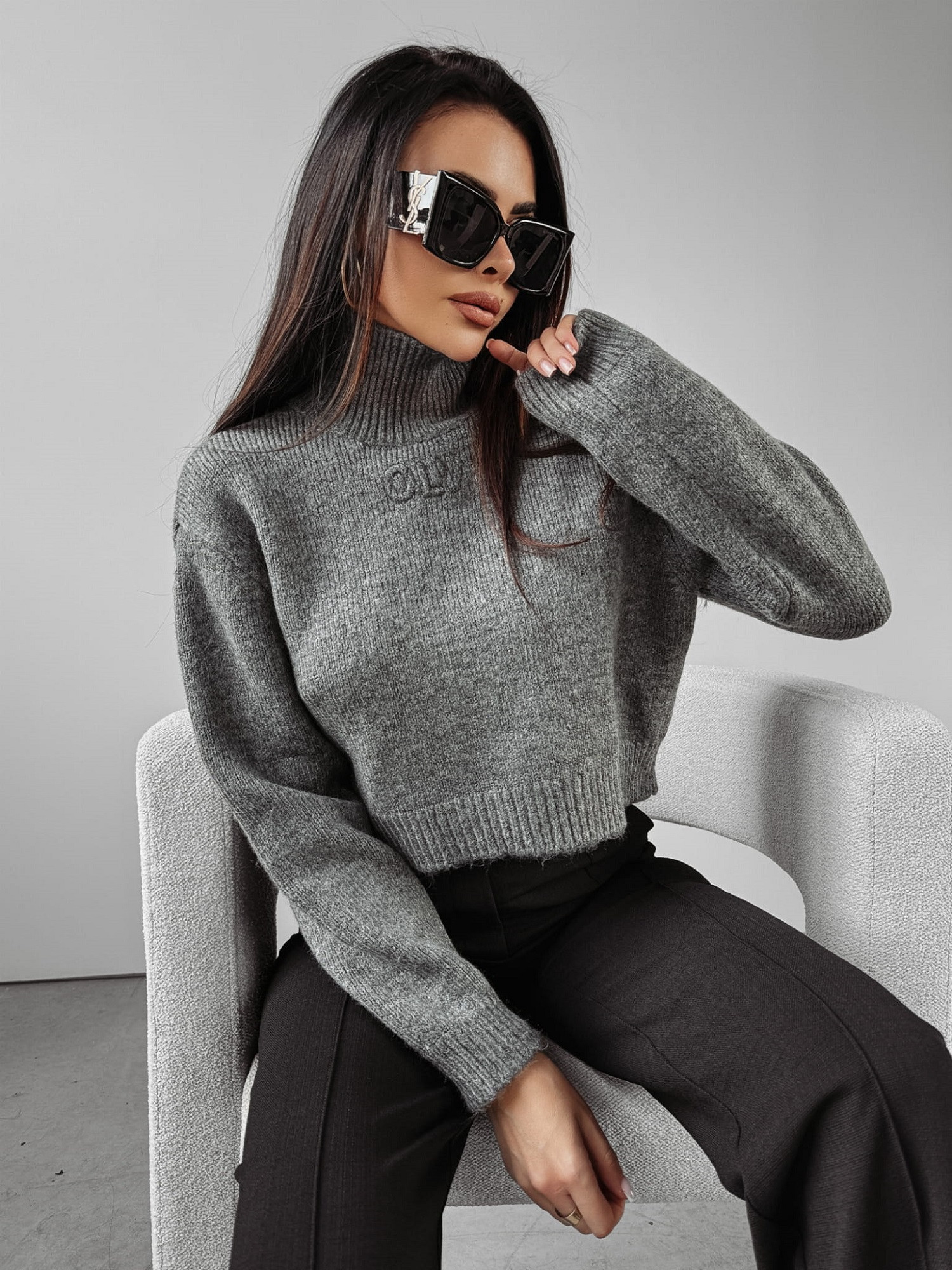 Sweter z golfem o prostym fasonie, o lekko obniżonej linii ramion. Brzegi swetra wykończone ściągaczem. Na przodzie znajduje się wytłoczone logo OLV.