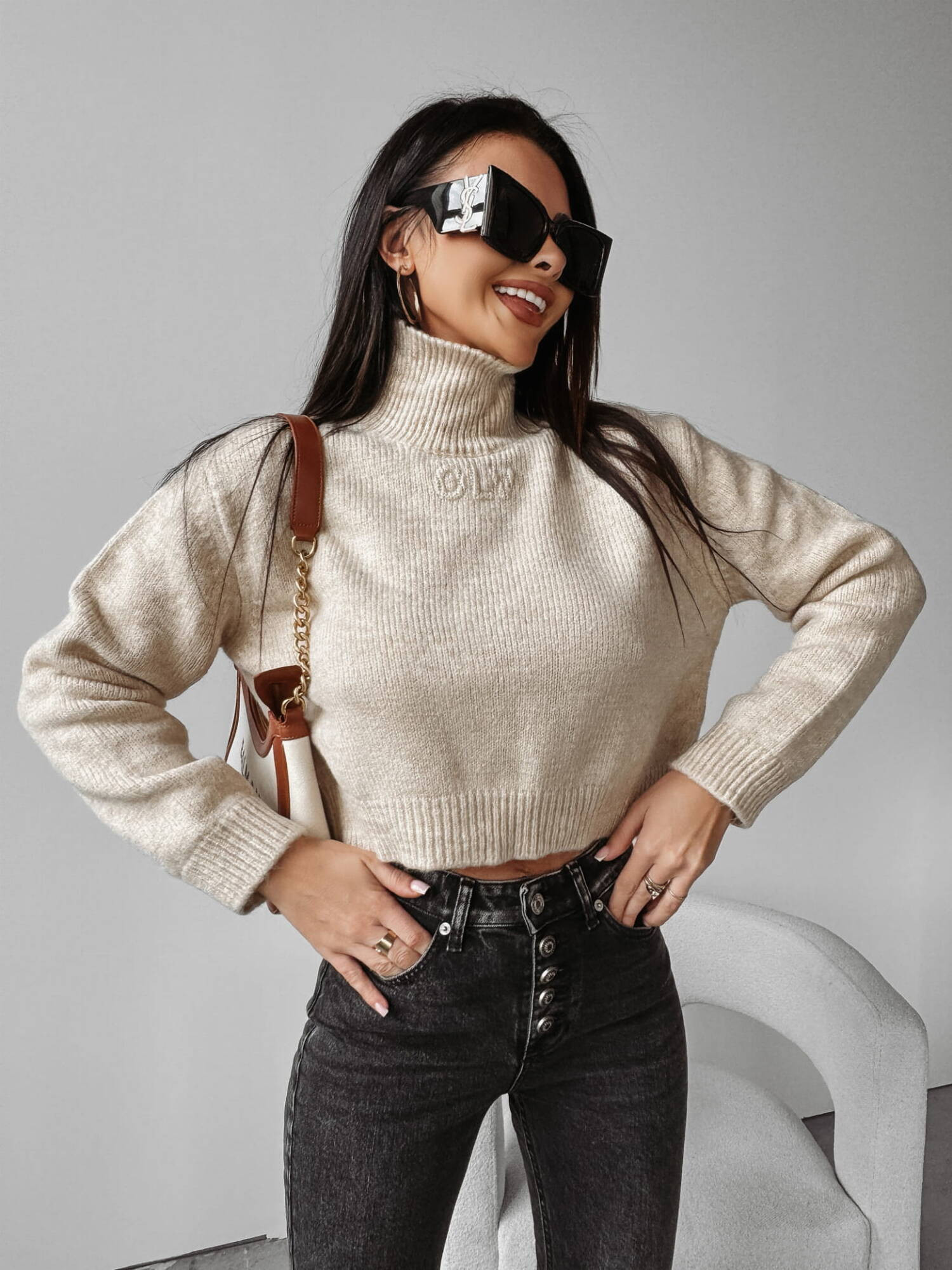 Sweter z golfem o prostym fasonie, o lekko obniżonej linii ramion. Brzegi swetra wykończone ściągaczem. Na przodzie znajduje się wytłoczone logo OLV.