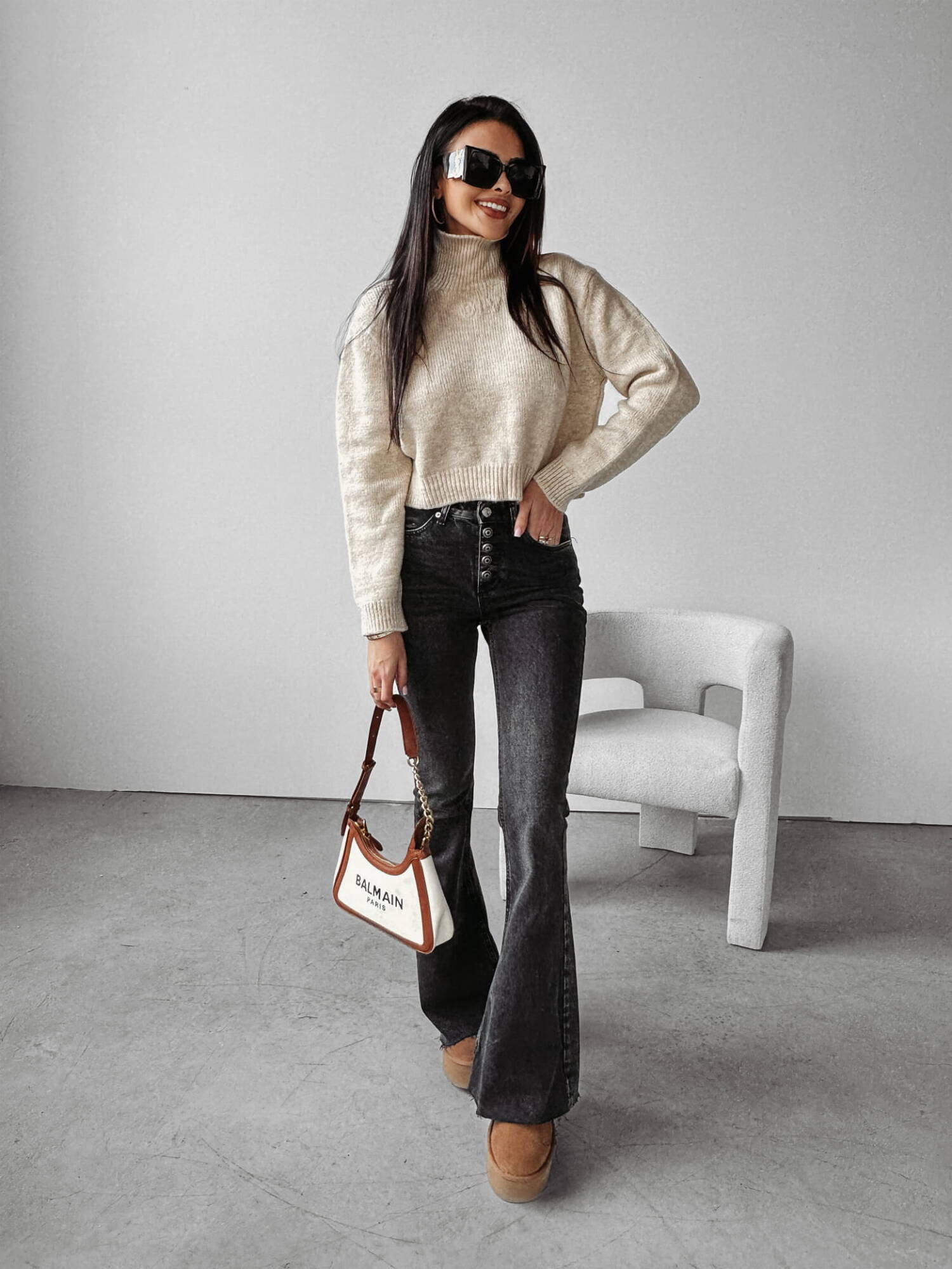 Krótki luźny sweter z półgolfem wykonany z grubej przędzy