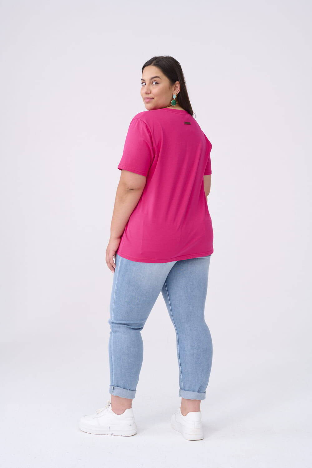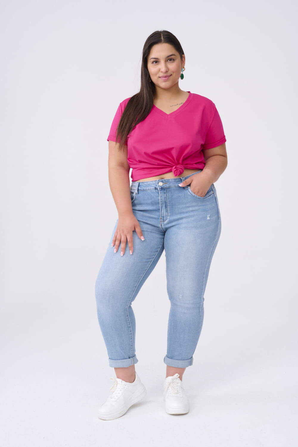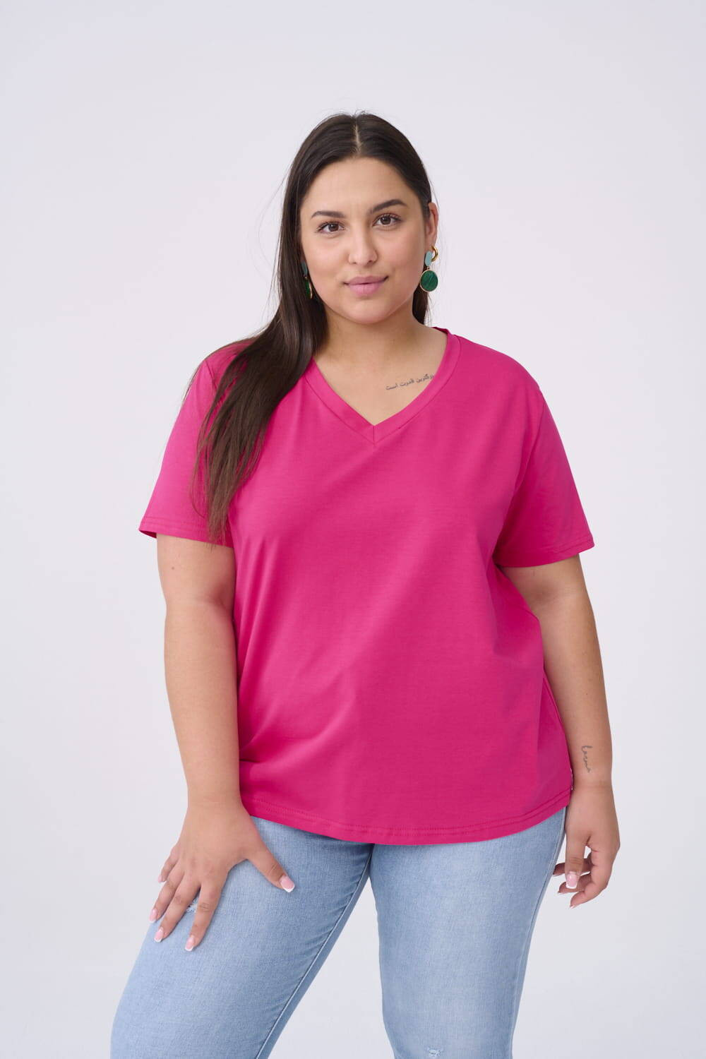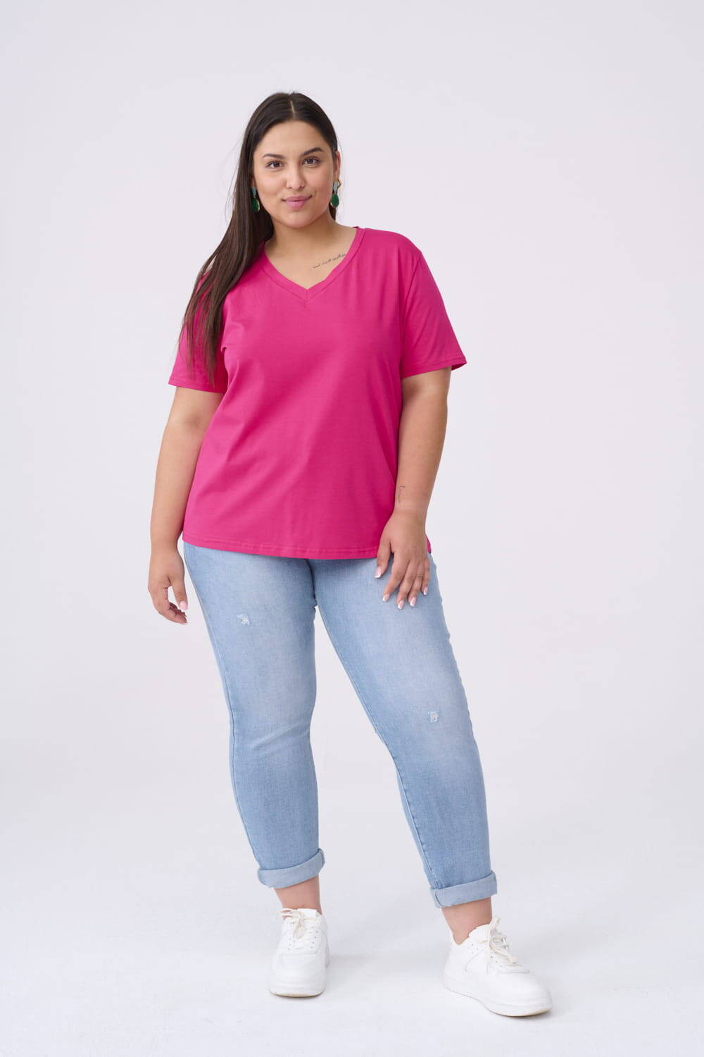 Nieco luźniejszy t-shirt damski z dekoltem w serek wykonany z miękkiej i elastycznej tkaniny bawełnianej. Lekko rozszerzany ku dołowi.
