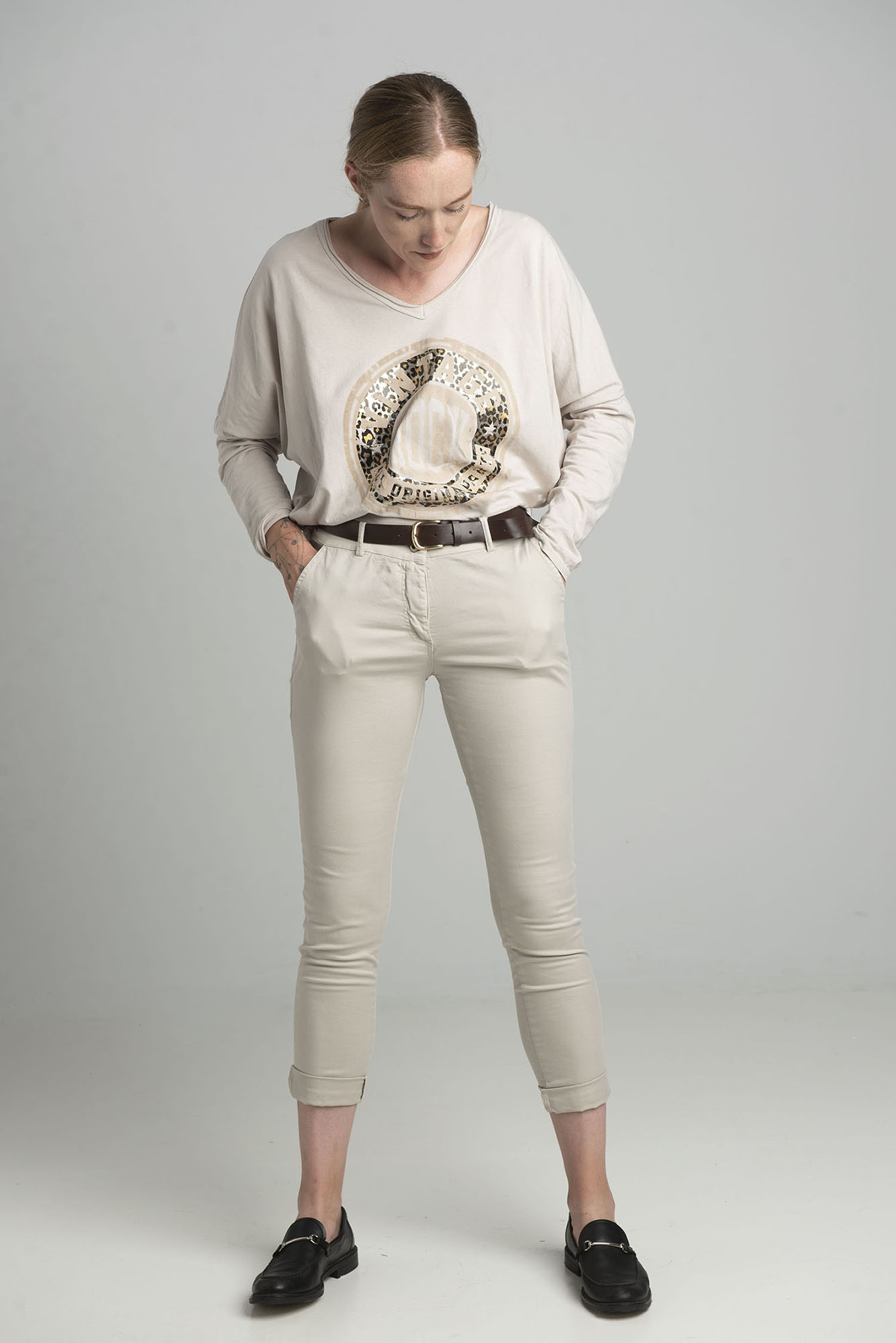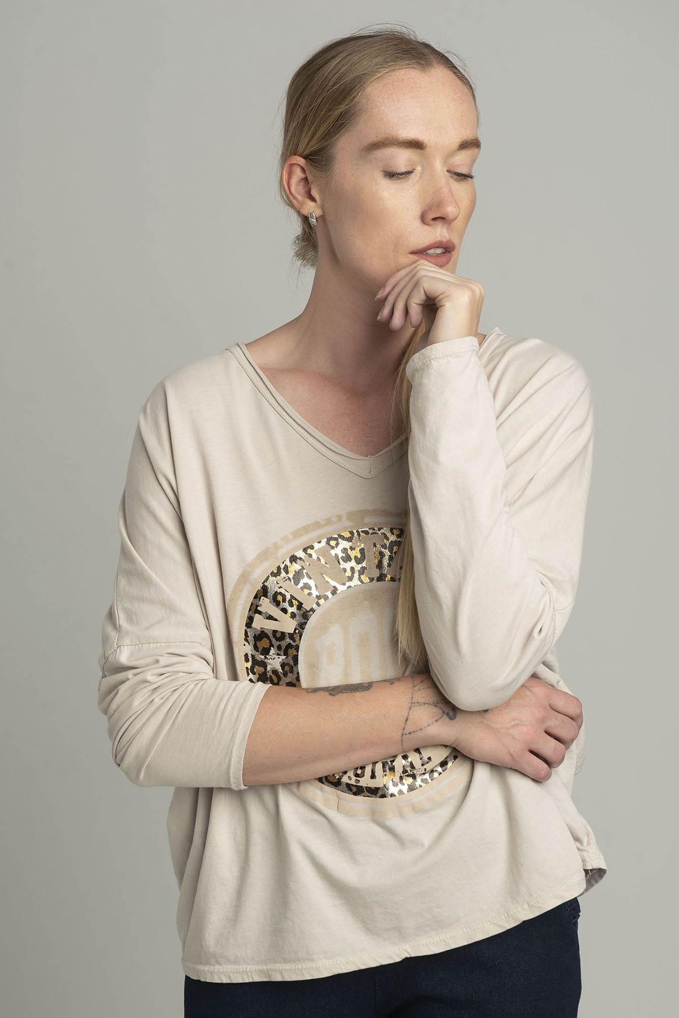 Beżowa bluzka oversize z błyszczącym nadrukiem