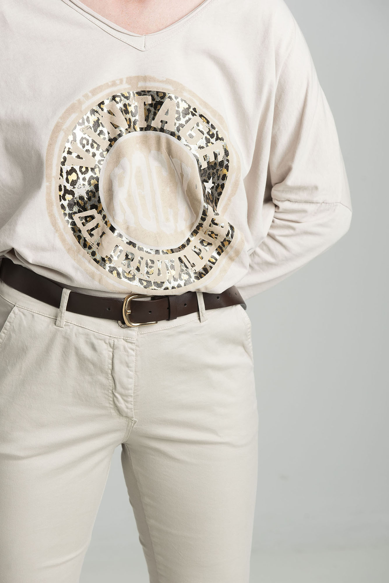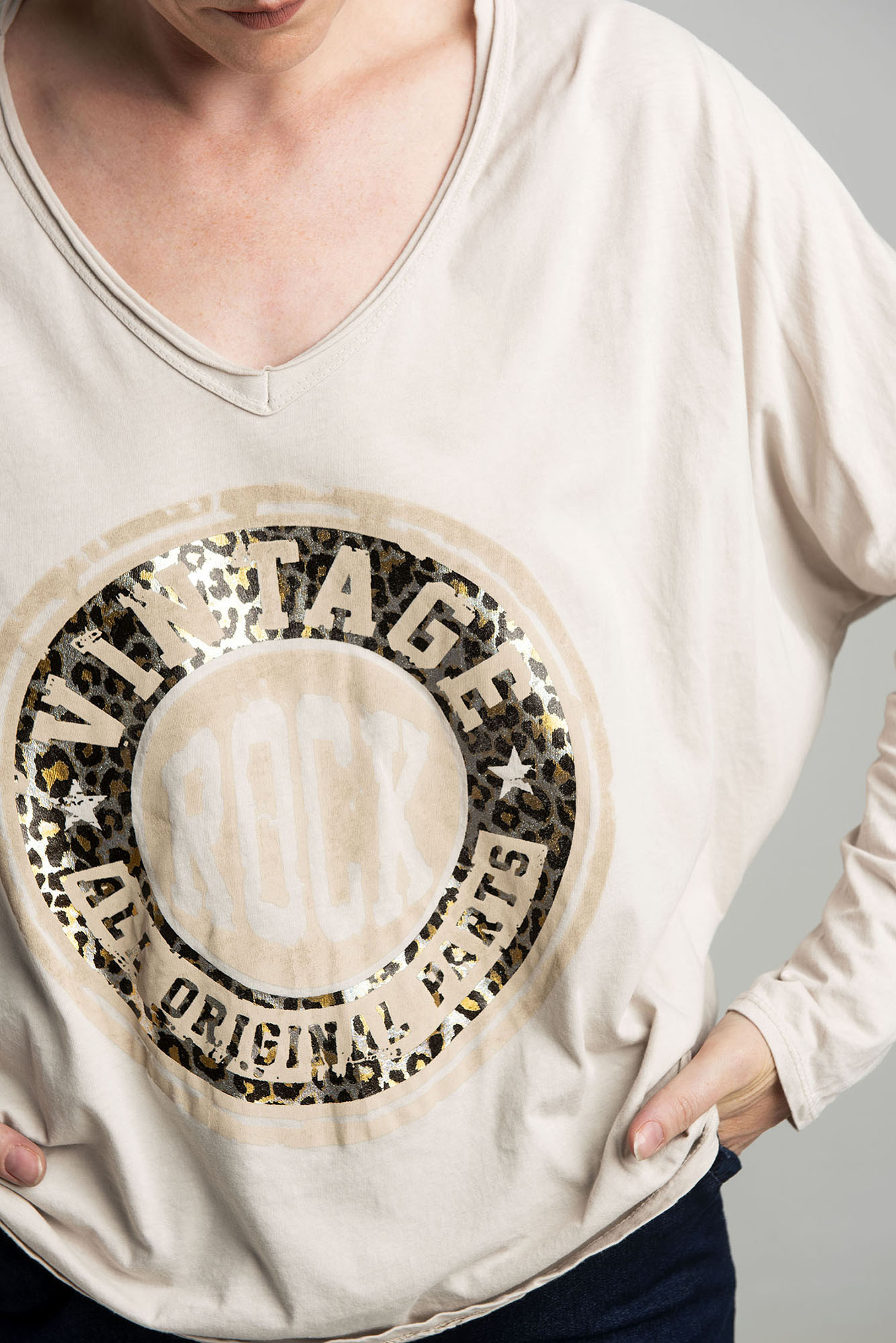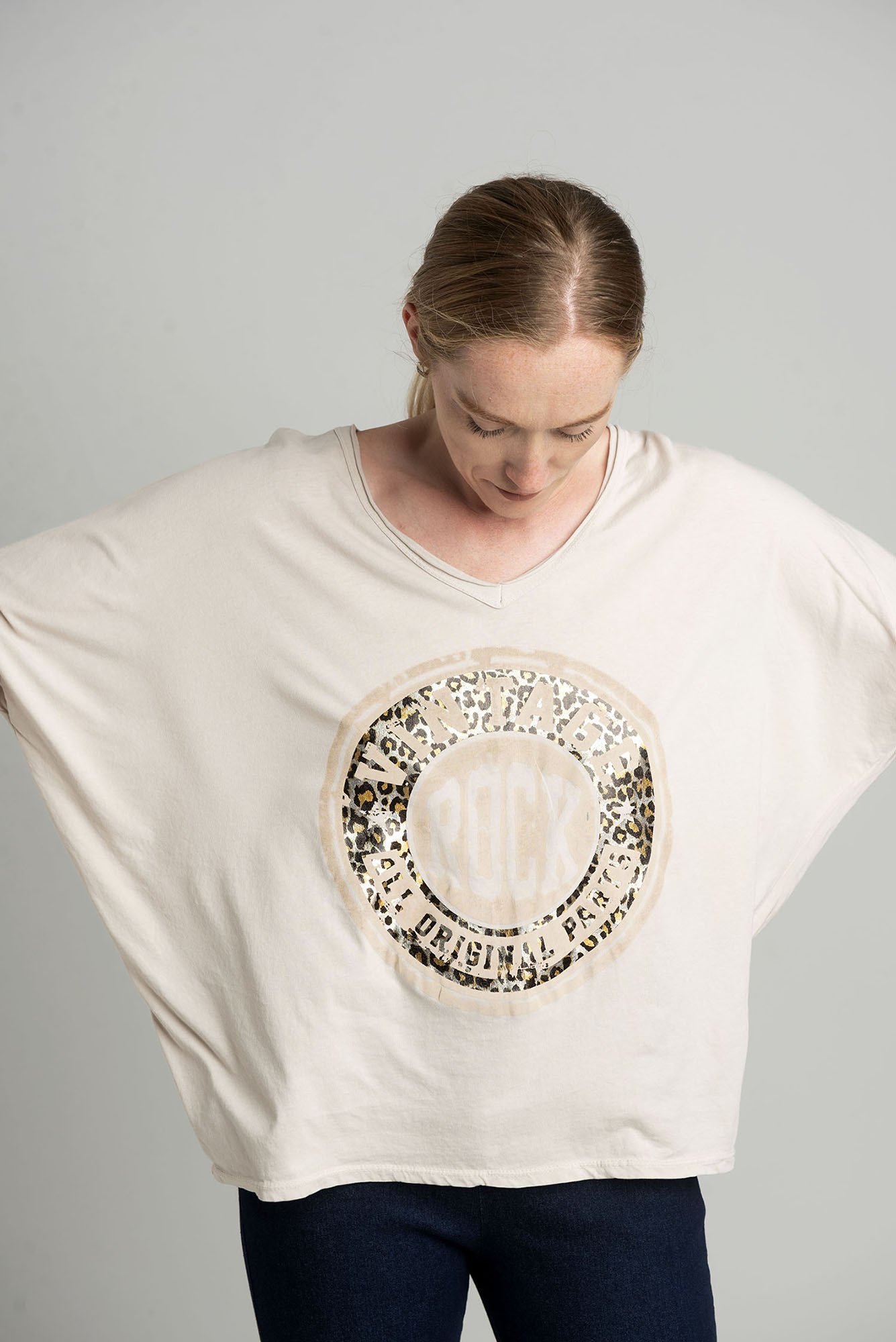 Beżowa bluzka oversize z nadrukiem ROCK w kształcie koła